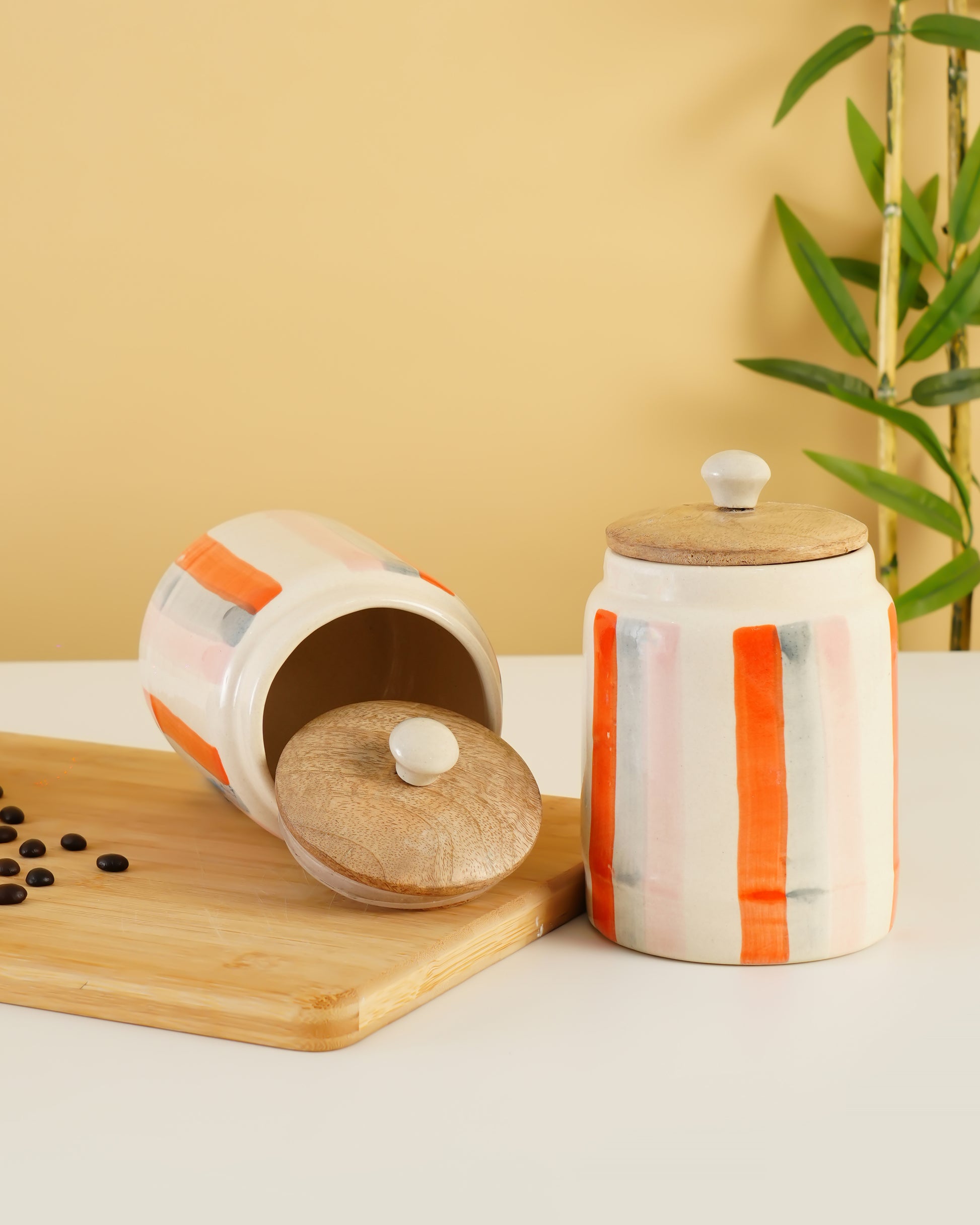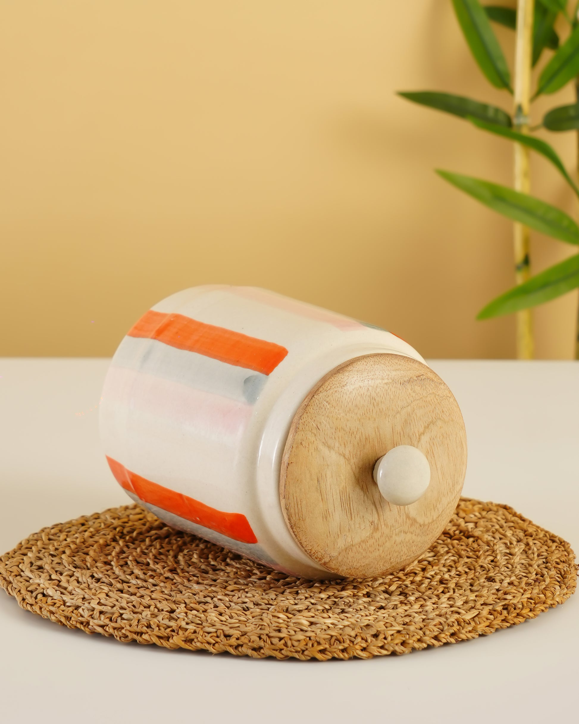 A modern ceramic storage jar with hand-painted stripes and a natural wooden lid—perfect for stylish kitchen organization.