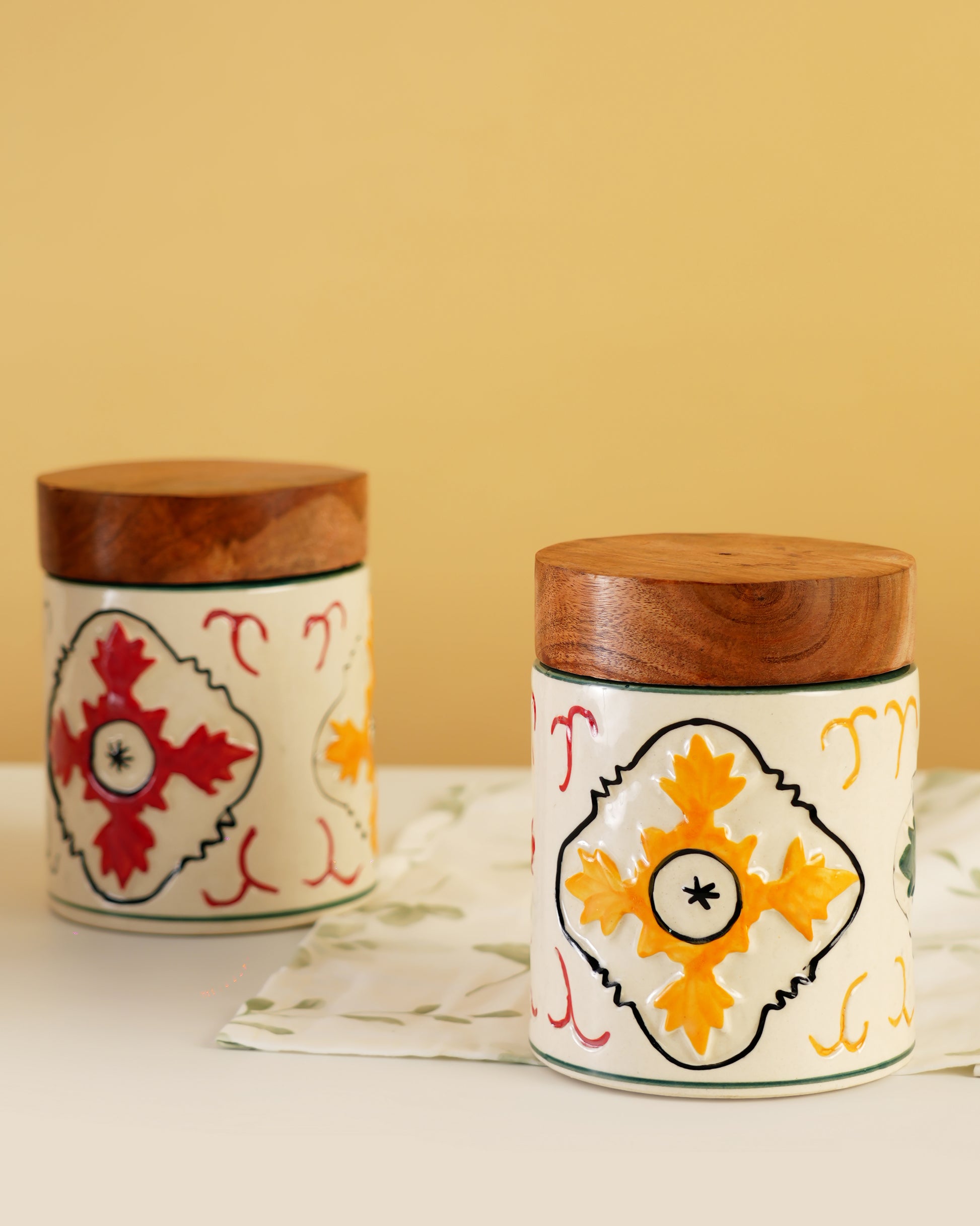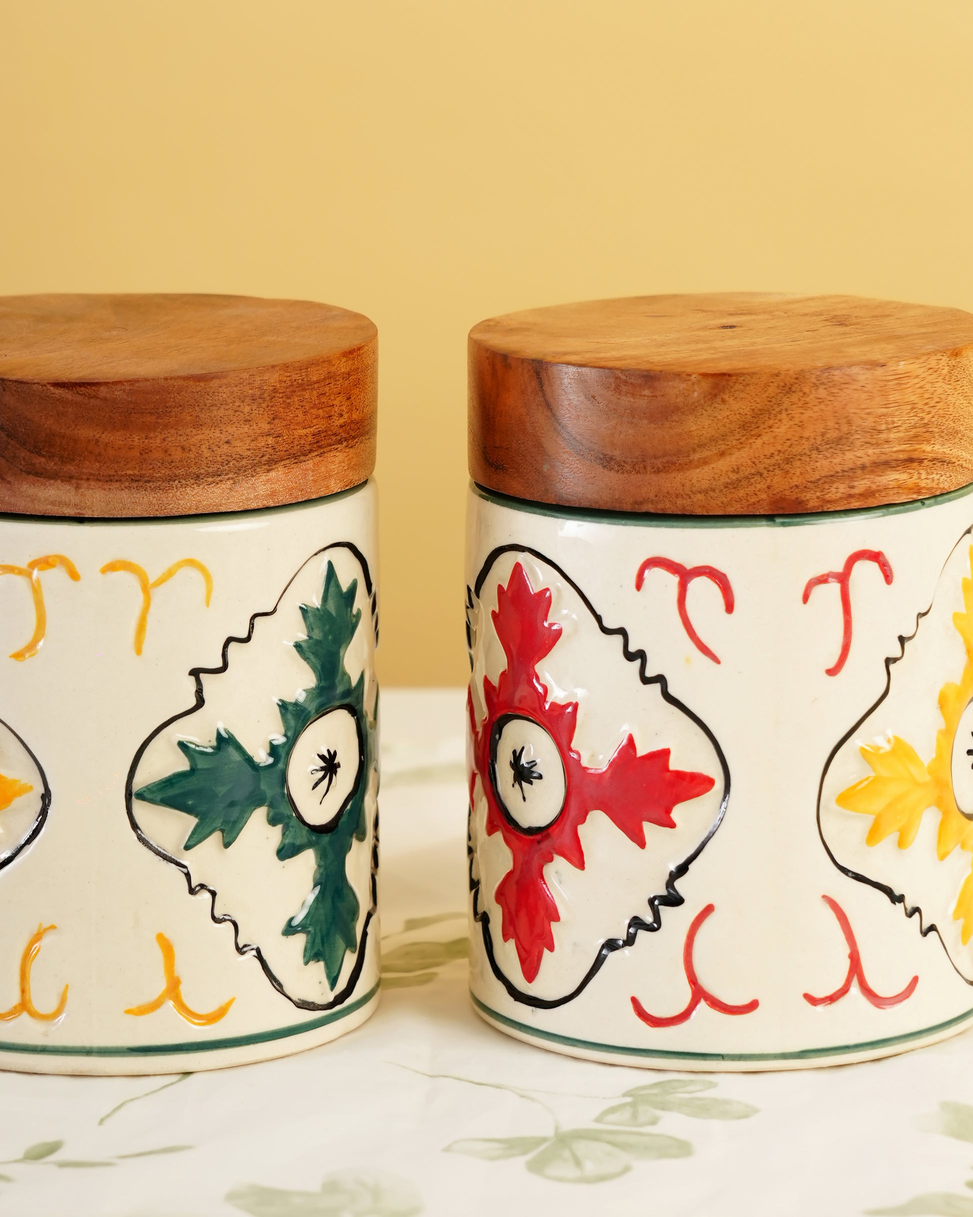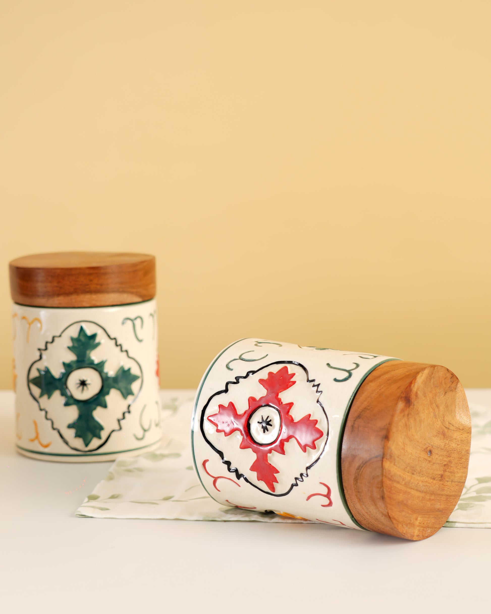 A hand-painted ceramic jar with a solid wooden lid, designed for stylish everyday storage—from cookies and snacks to coffee and tea.