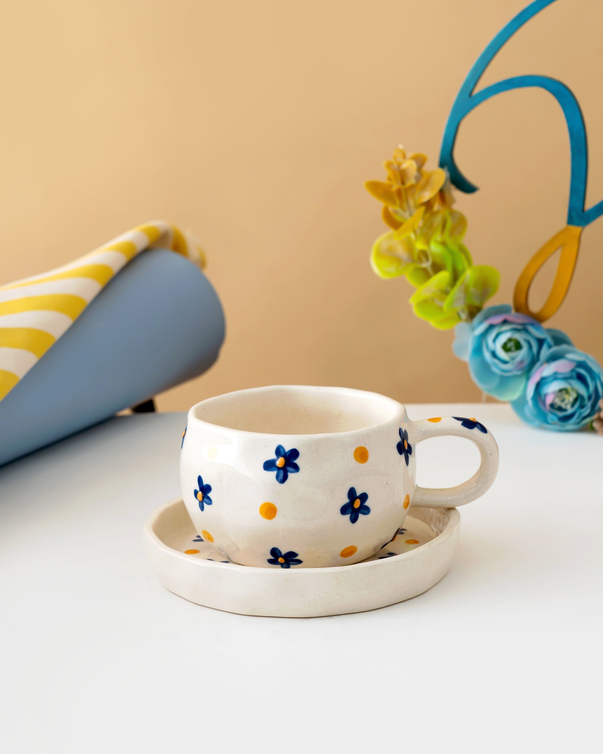 Bring a touch of charm to your everyday coffee moments with this beautifully hand-painted floral cup & saucer set. Featuring delicate blue flowers and soft golden dots on a creamy ceramic base, this piece feels cheerful yet timeless.