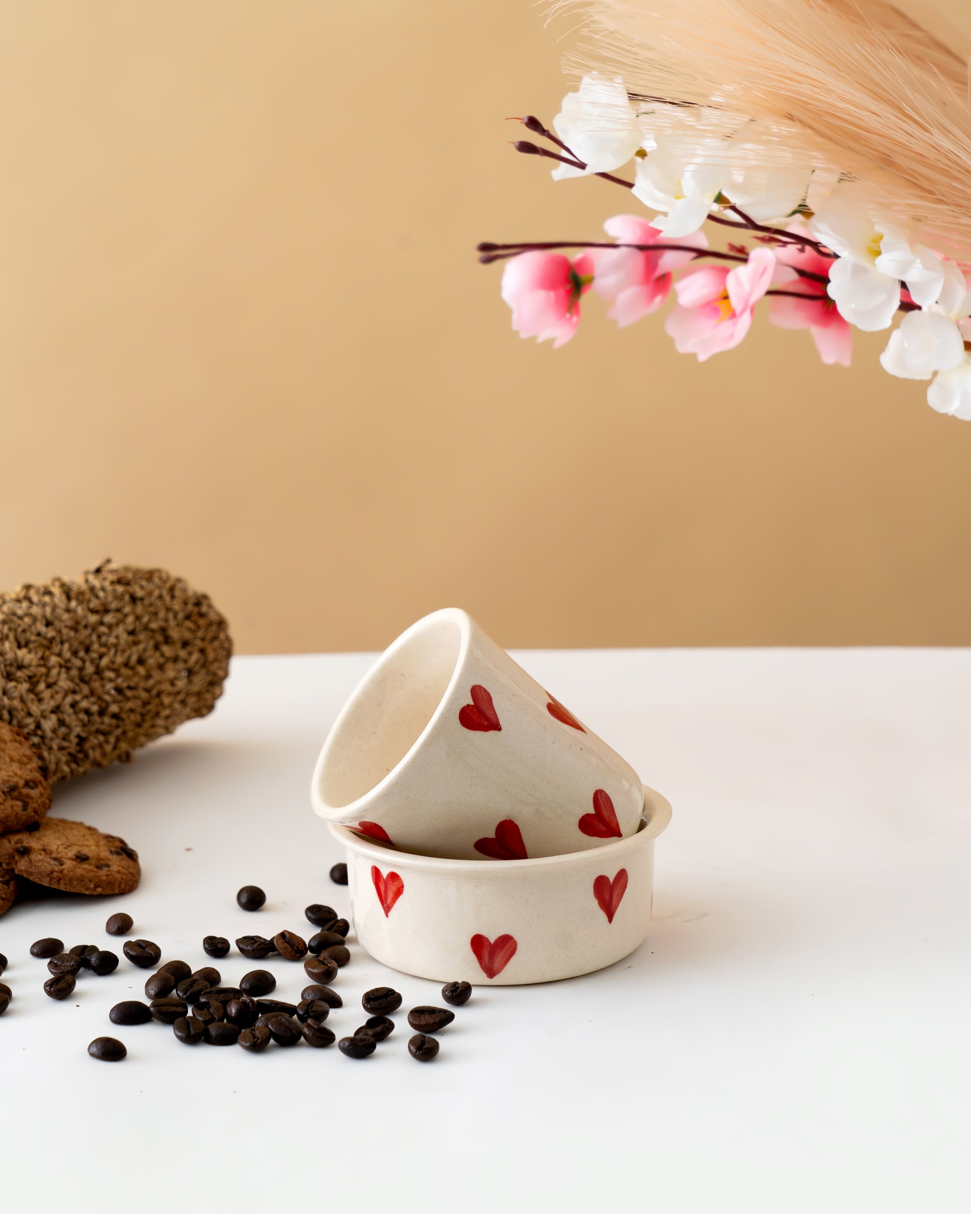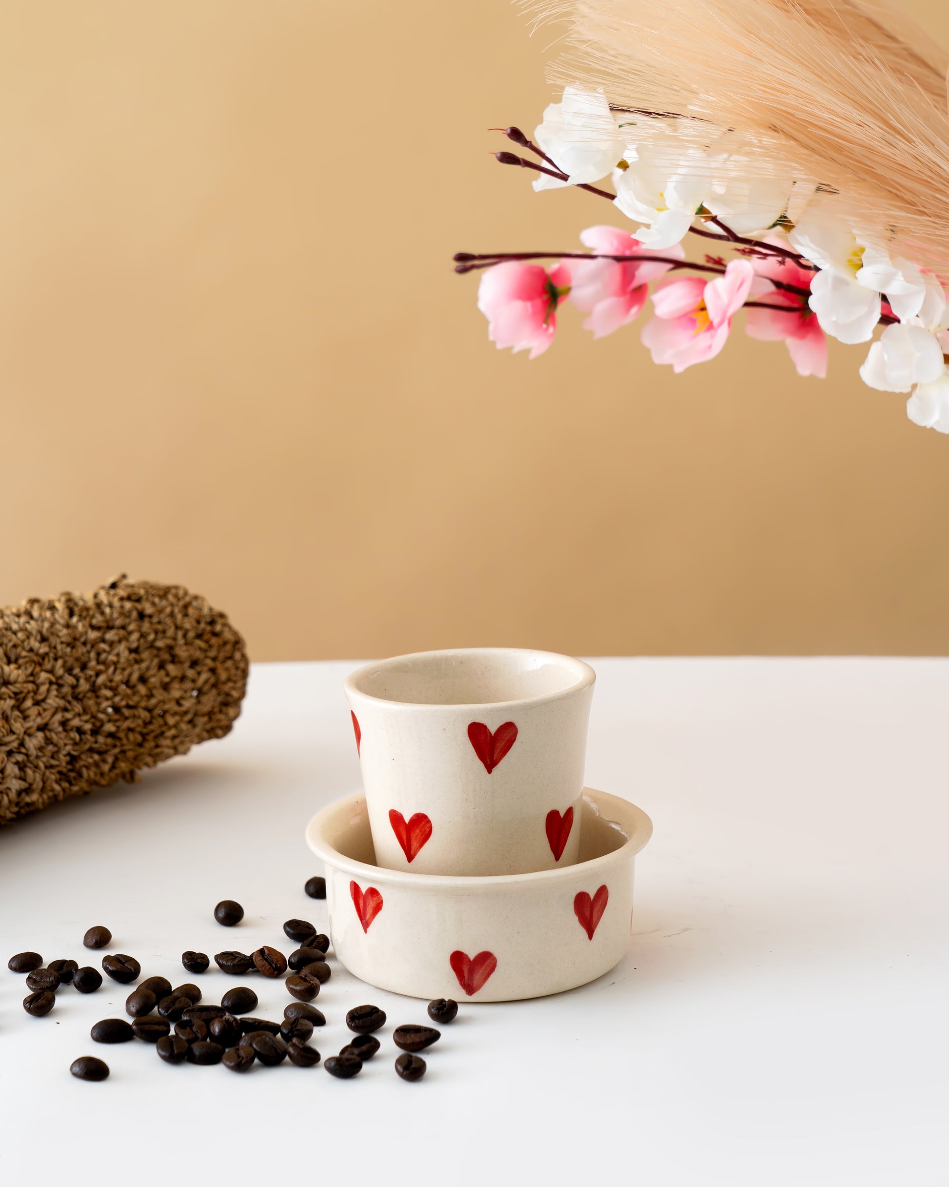 Celebrate everyday moments with this sweet, handcrafted heart cup set. Each piece is made from premium ceramic and decorated with charming hand-painted red hearts — a simple yet expressive design that instantly adds warmth to your table.