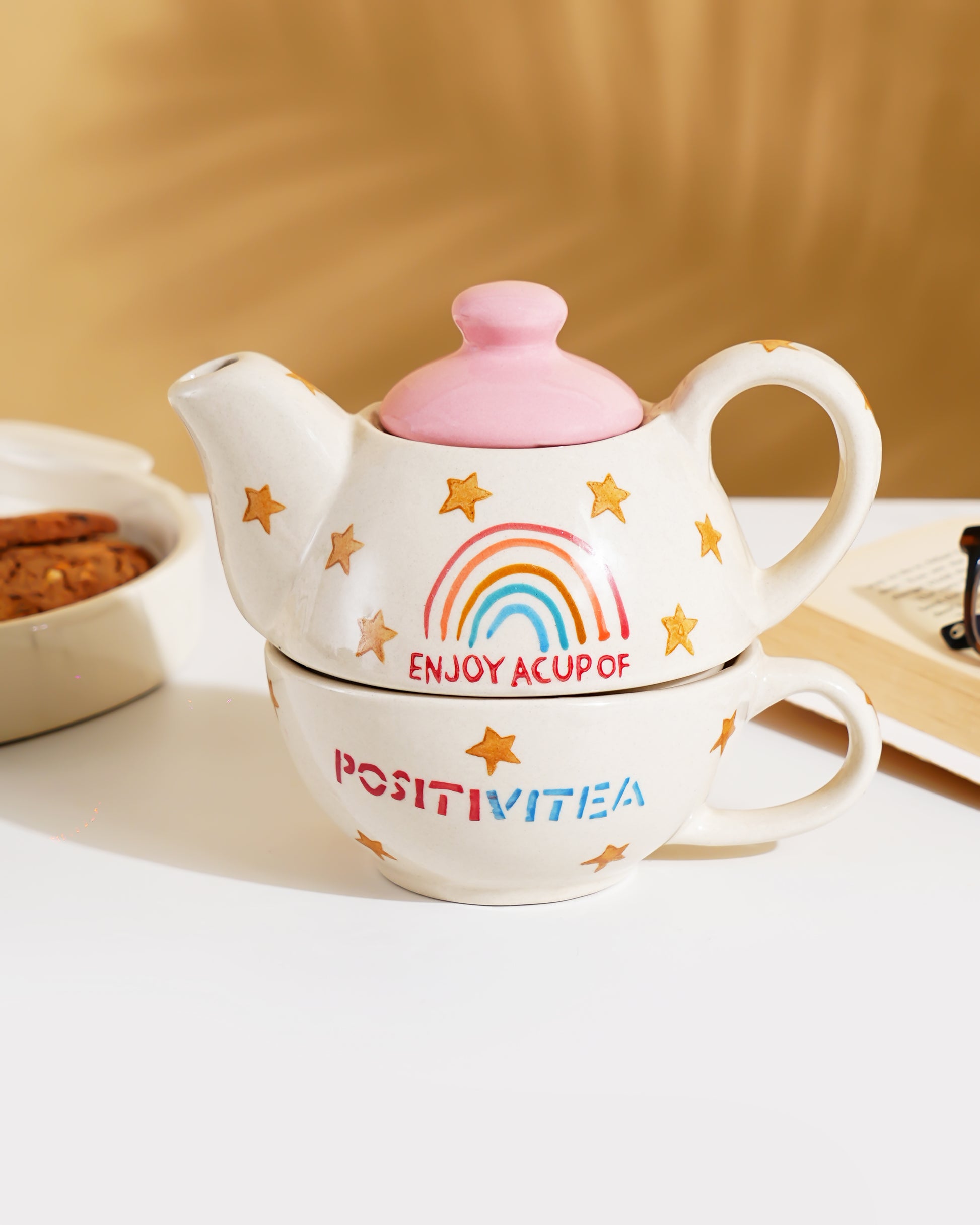 Rainbow Positivity Ceramic Tea Set – Teapot with Cup (2-in-1 Stackable Design) - RVKTL41