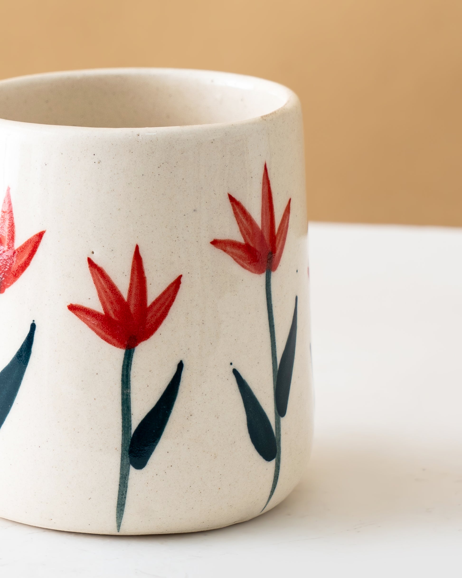 Inspired by nature’s quiet beauty, this ceramic mug set features hand-painted red floral motifs on a soft ivory base. The simple yet expressive design brings warmth and charm to your everyday tea or coffee moments, making each sip feel calm and comforting.