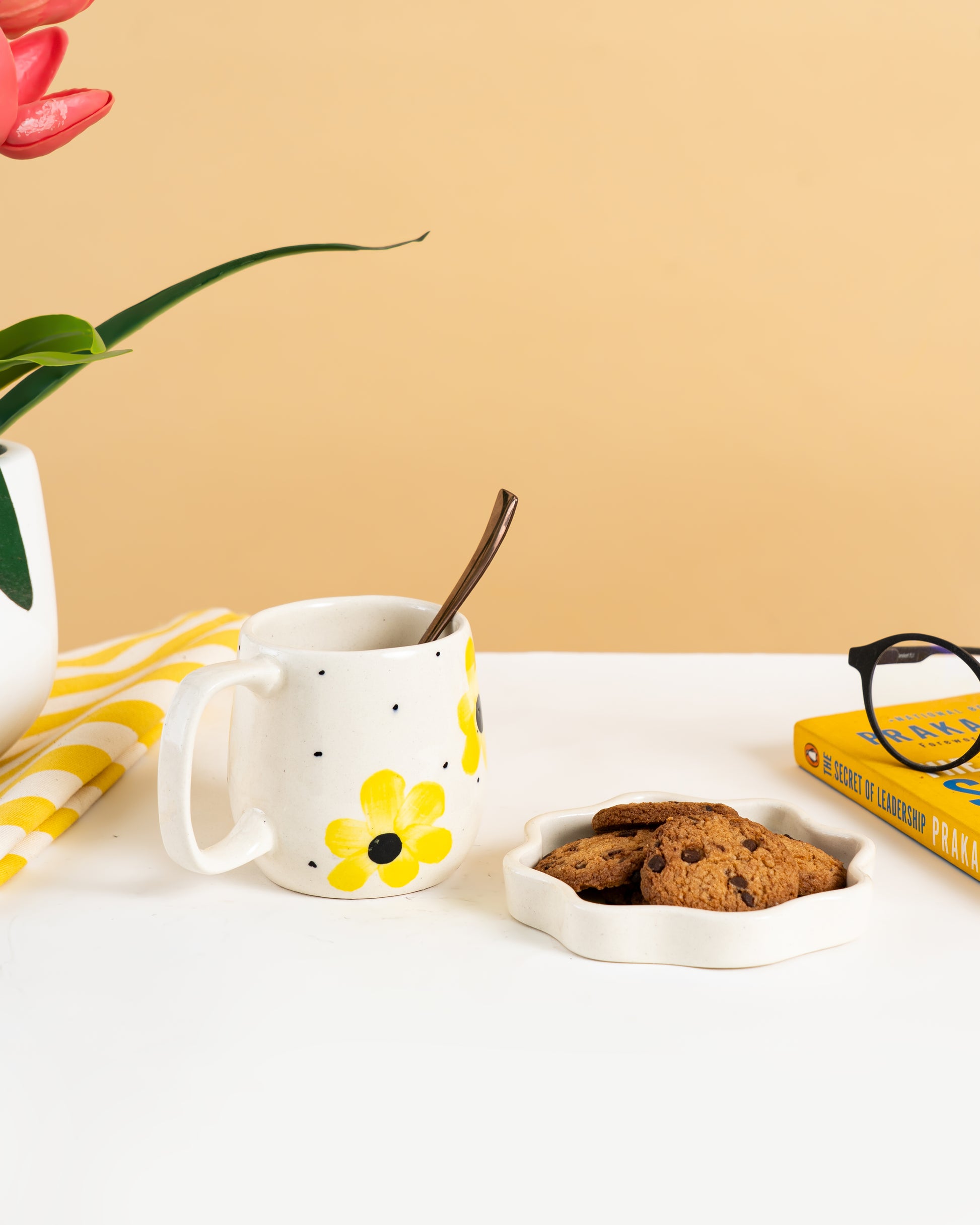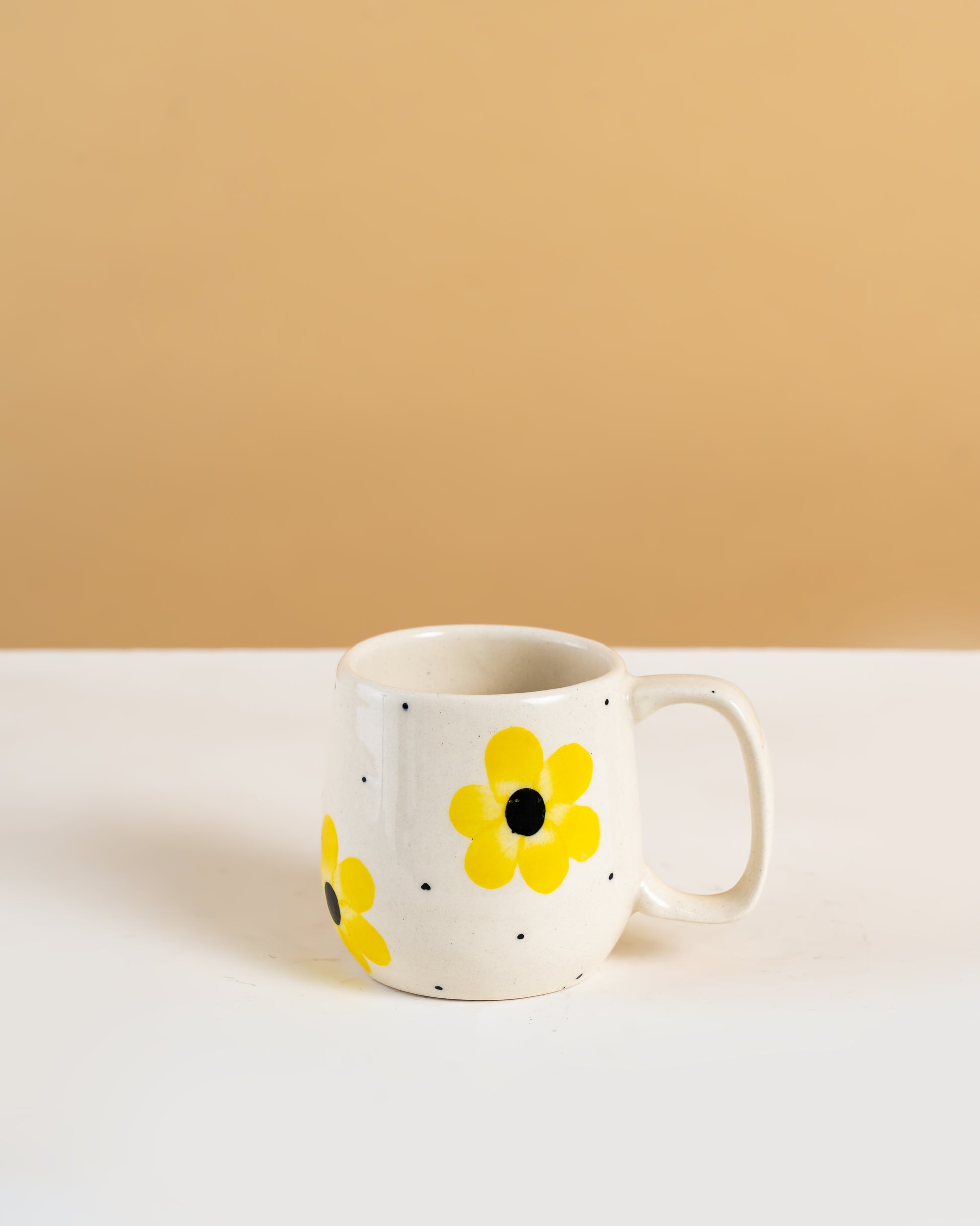 The warm yellow blooms and delicate speckled accents are balanced by a creamy ceramic base, creating a design that feels both playful and timeless. Each piece is carefully crafted to add warmth and character to your coffee breaks, snack moments, or quiet afternoons.